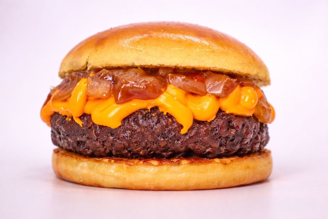 Pão brioche, 1 hamburguer de 150g (carne artesanal), 1 fatia de queijo cheddar e nutella.