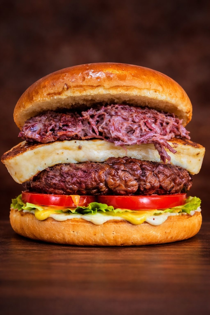 Pão brioche, 1 hamburguer de 150g (carne artesanal), 1 fatia de queijo coalho, charque desfiada, cebola caramelizada, tomate, alface e molho especial da casa.