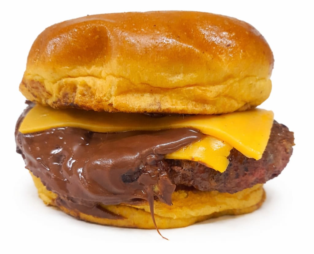 Pão brioche, 1 hamburguer de 150g (carne artesanal), 1 fatia de queijo cheddar e nutella.